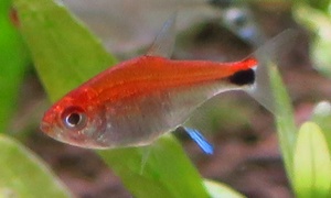 ホタルのような光るスポットが尾びれの付け根に入る「ホタルテトラ」の一種で、赤いホタルスポットに加えて体全体も赤くなるのが特徴です。 |
