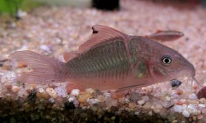 ポピュラーなコリドラスで、背びれの黒い模様と白い体に入る斑点や網目状の模様が特徴です。 |