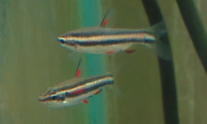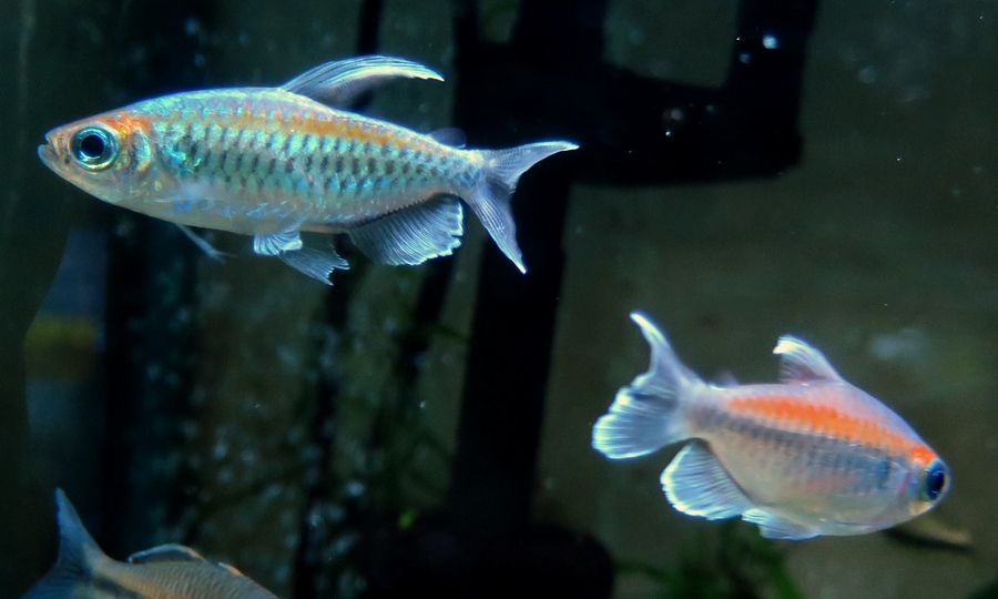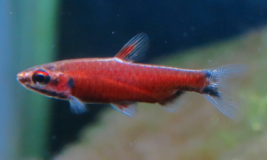 透明度の高いガラスのような体と、赤い尾びれという個性的な外見のテトラです。 |