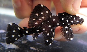 レポラカンティクス属のプレコで、真っ黒な地肌にはっきりした白いスポットが入ります。通常のスタークラウンプレコより大きくなります。 |