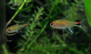 背びれと尻びれが長く伸びる、ロージーテトラに似た赤の体色が特徴のテトラです。色が出ると、特に雄はピンク〜赤紫が全身に乗り、背びれがカールして美しくなります。 |
