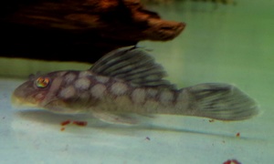 非常に大きいスポットがびっしりと入る、独特の模様をしたプレコです。スポットが密に入るので、網目模様のようにも見えます。 |