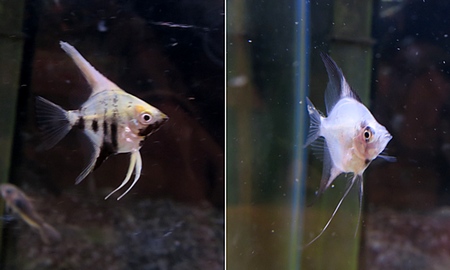 ■アルタムエンゼル (残3匹) 小|¥9800 スカラレエンゼルとは別種のレアなエンゼルフィッシュで、上下に長く伸びるヒレと濃淡のバンドが交互に入る模様が特徴です。 |