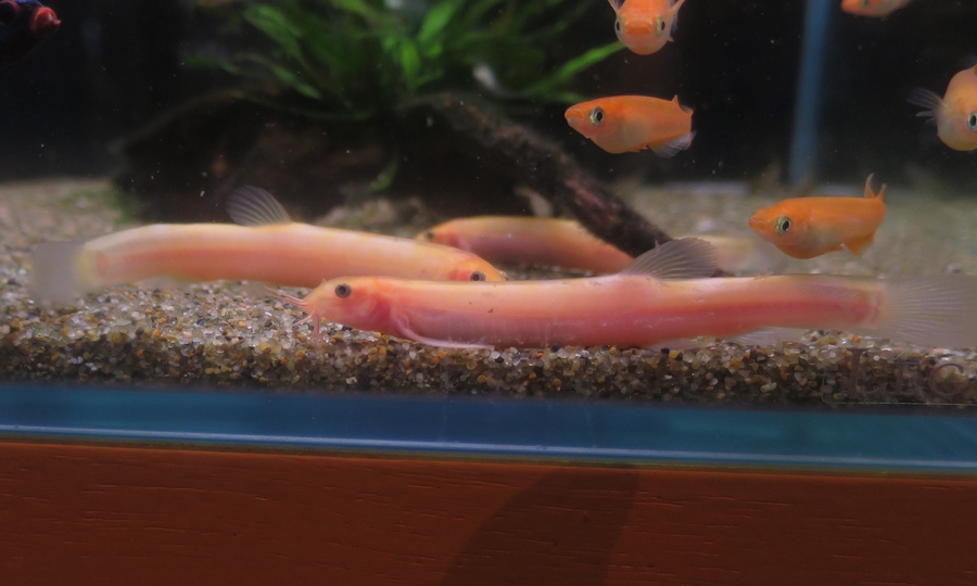 マドジョウの改良品種で、ヒドジョウより色素が少なくアルビノ特有の赤い目、全体により明るい色合いになります。 |