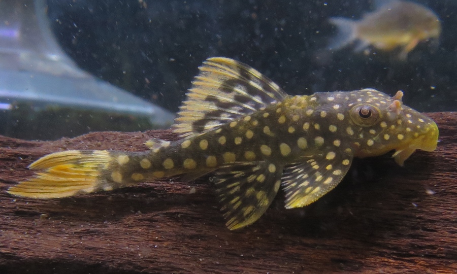 ■ゴールドエッジマグナムプレコ 25.11入荷 4cm|)¥16800 体のスポット模様とヒレに入るオレンジのエッジ模様と、煌びやかな体色をしたマグナム系プレコです。 |